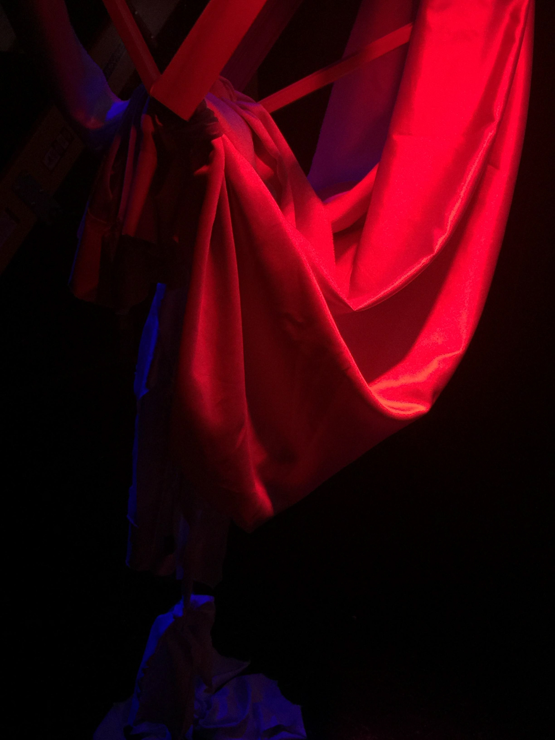 A set of hanging fiber sculptures that represent an abstracted moment of time experienced by me. Colored LED are used to paint the fabric white fabric.